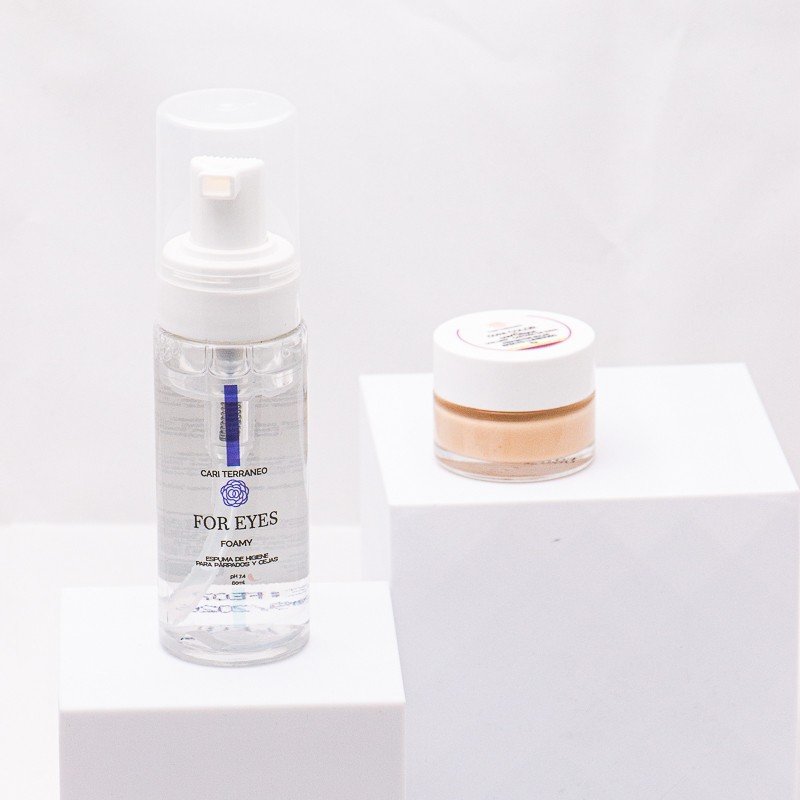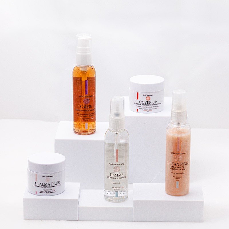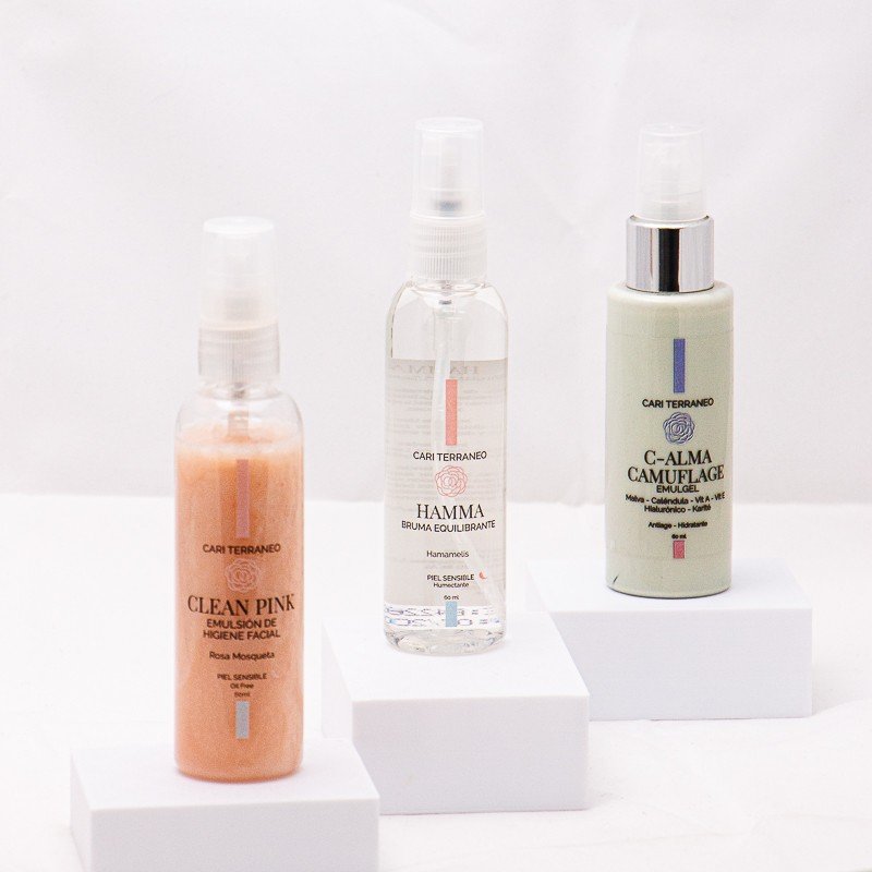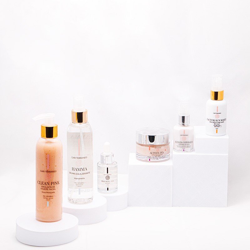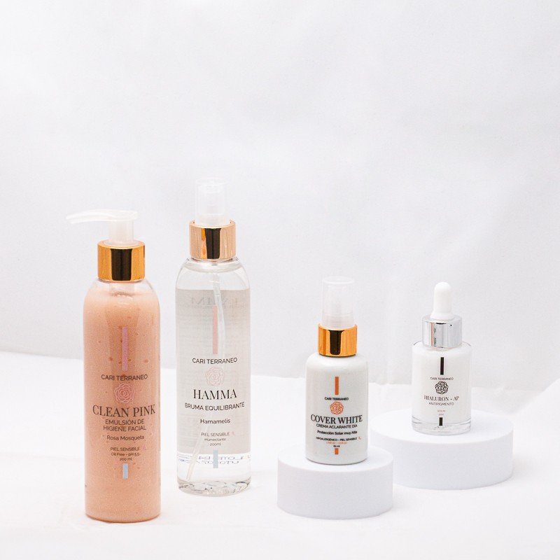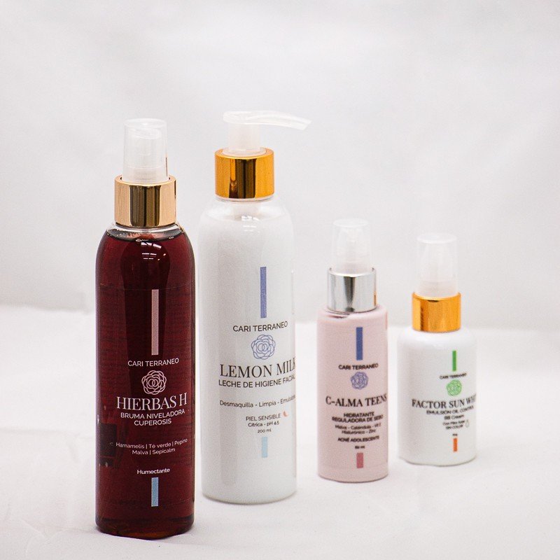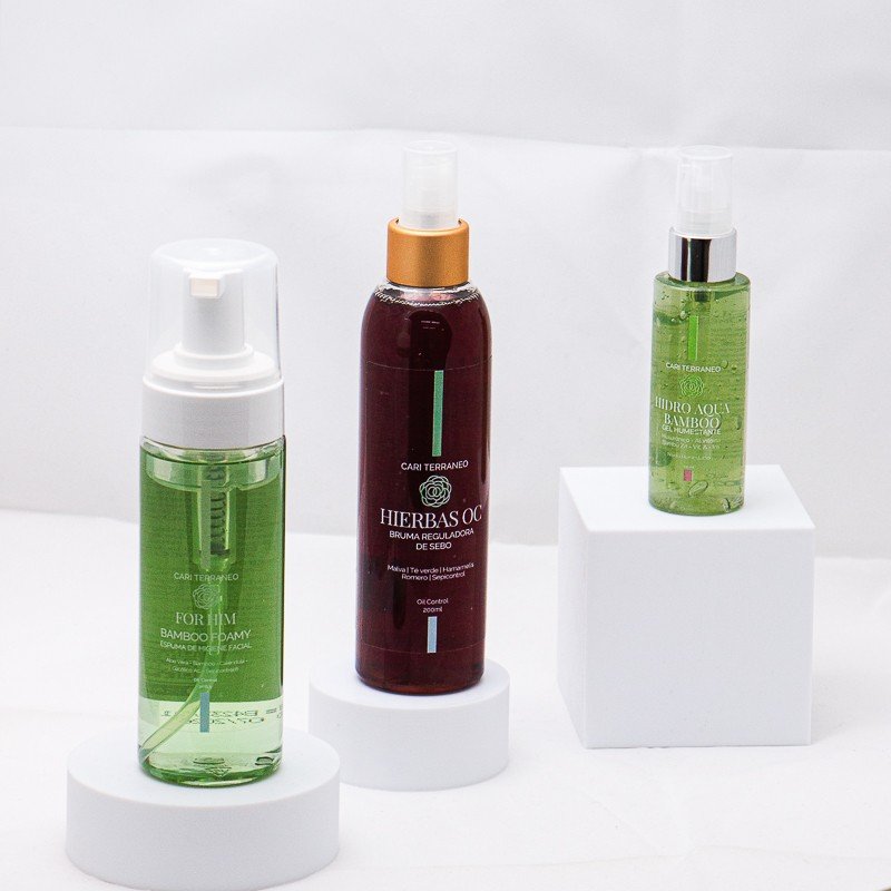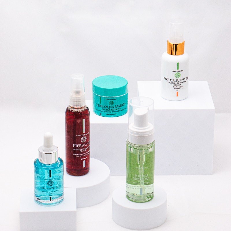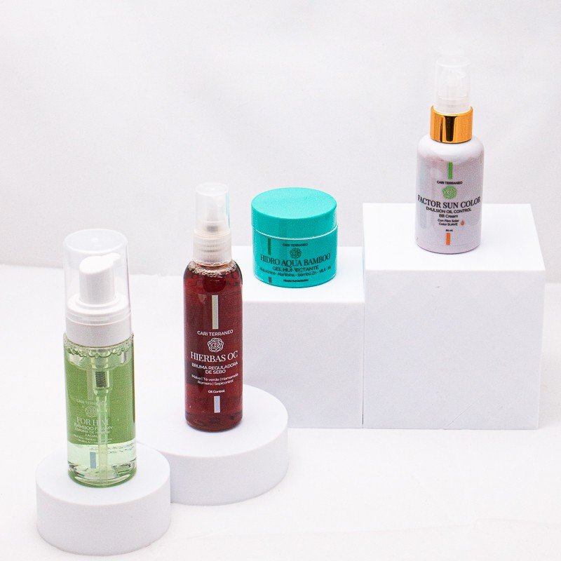 Limpiador + bruma + hidratante + protector solar + gel descongestivo.